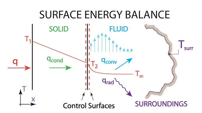 trong đó E_in biểu thị tất cả dòng năng lượng truyền đến bề mặt (kể cả dẫn nhiệt, bức xạ tới, hay nhiệt được mang đến bởi không khí nóng), còn E_out là tổng năng lượng thất thoát từ bề mặt qua đối lưu với môi trường, bức xạ ra ngoài, hoặc tản nhiệt vào không khí. Nếu phân tích trên một đơn vị diện tích bề mặt, phương trình này được diễn đạt cụ thể hơn: